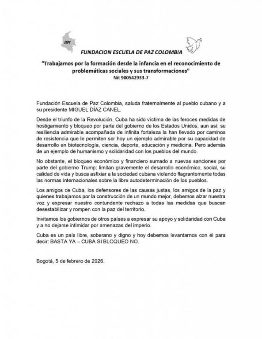La Fundación Escuela de Paz Colombia, organización dedicada a la formación en transformación de problemáticas sociales, emitió un comunicado público dirigido al pueblo cubano y a su presidente, Miguel Díaz-Canel.
