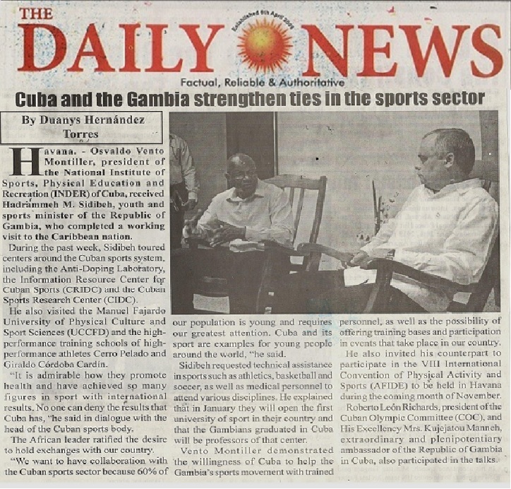 El periódico gambiano Daily News resalta hoy, 24 junio, una positiva visita realizada por el Ministro de Juventud y Deportes de Gambia, Hadrammeh M. Sidibeh, a Cuba, donde tuvo como principal anfitrión al presidente del Instituto Nacional de Deportes, Educación Física y Recreación (INDER), Osvaldo Vento Montiller, y durante la cual ambos coincidieron en estrechar los nexos en el sector deportivo