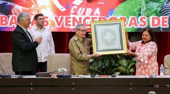 En otro momento de la clausura, la secretaria general de la FMC, Teresa Amarelle Boué, entregó un tapete, confeccionado a mano por la artesana trinitaria Lucía Jiménez Hernández, al General de Ejército como reconocimiento.