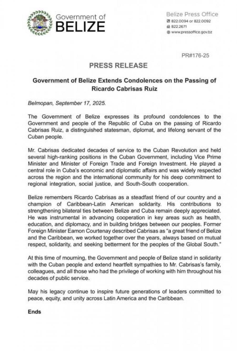 Belmopán, 17 septiembre 2025. El Gobierno de Belice expresó hoy sus “profundas condolencias” por el fallecimiento de Ricardo Cabrisas Ruiz, vice primer ministro cubano y figura clave en la economía y la diplomacia de la isla.