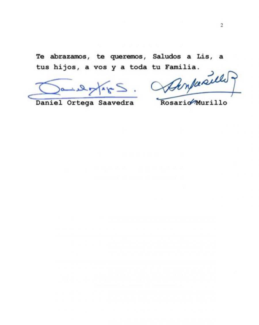 Firmado por el presidente Daniel Ortega y la vicemandataria Rosario Murillo, el texto desea salud, paz interior a Díaz-Canel y todo lo que permita su “inteligencia y sensibilidad en estos tiempos de creación del nuevo mundo”.