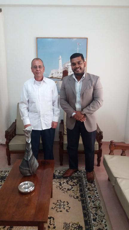 Durante el encuentro el Embajador reiteró la invitación del Sr. Orlando Hernández Guillén, Presidente de la Cámara de Comercio de la República de Cuba al Sr. Deodat Indar, Presidente de la Cámara de Comercio e Industria de Georgetown, para participar en la XXXVI Edición de la Feria (FIHAV 2018), que tendrá lugar del 29 de octubre al 2 de noviembre de 2018, en su habitual espacio de EXPOCUBA.