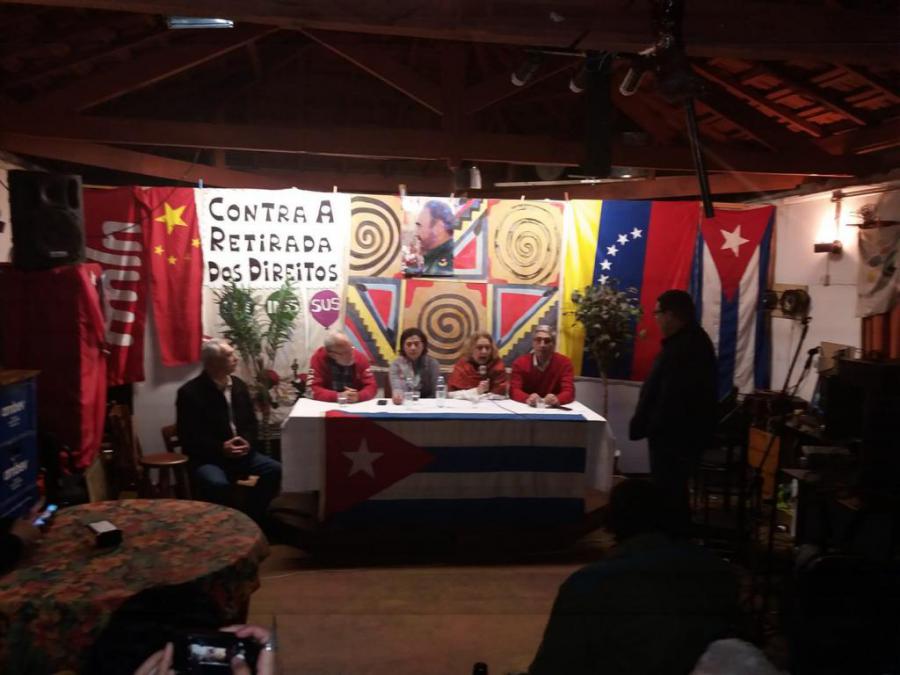 A mesa foi composta por Socorro Gomes, presidenta do Conselho Mundial pela Paz; Walter Sorrentino, Vice-presidente nacional e Secretário de Relações Internacionais do PCdoB; Jose Reinaldo Carvalho, Diretor da CEBRAPAZ e da Secretaria Política do PCdoB; Ernesto Pischler do PCB e a Cônsul Geral de Cuba em São Paulo, Nélida Hernández Carmona.