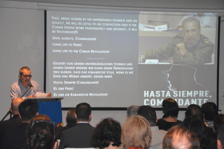 El Embajador de Cuba en Austria, Juan Antonio Fernández Palacios, en su intervención destacó la trayectoria revolucionaria y humanista de Fidel, de universales dimensiones. Añadió que, siendo consecuentes con su legado, como revolucionarios continuamos su obra y defendemos día a día la Revolución comprometidos con su desarrollo