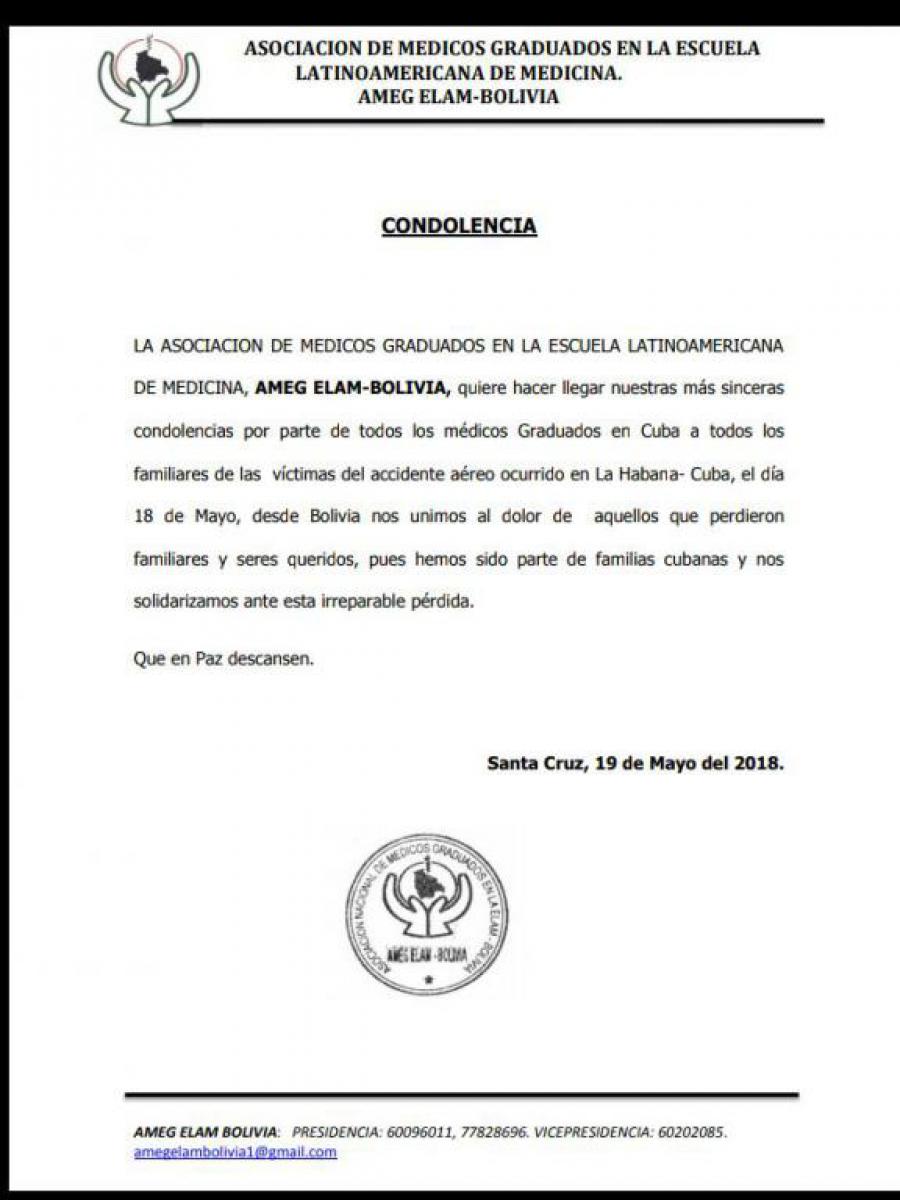 Santa Cruz, Bolivia, 19 de mayo de 2018.- La Asociación de Médicos Graduados en Cuba rindió homenaje al Apóstol cubano José Martí en el Aniversario 123 de su caída en combate. En este marco, dieron a conocer una nota de prensa en homenaje a los fallecidos en el lamentable accidente aéreo ocurrido al mediodía del 18 de mayo del 2018. (Consulado General de Cuba)