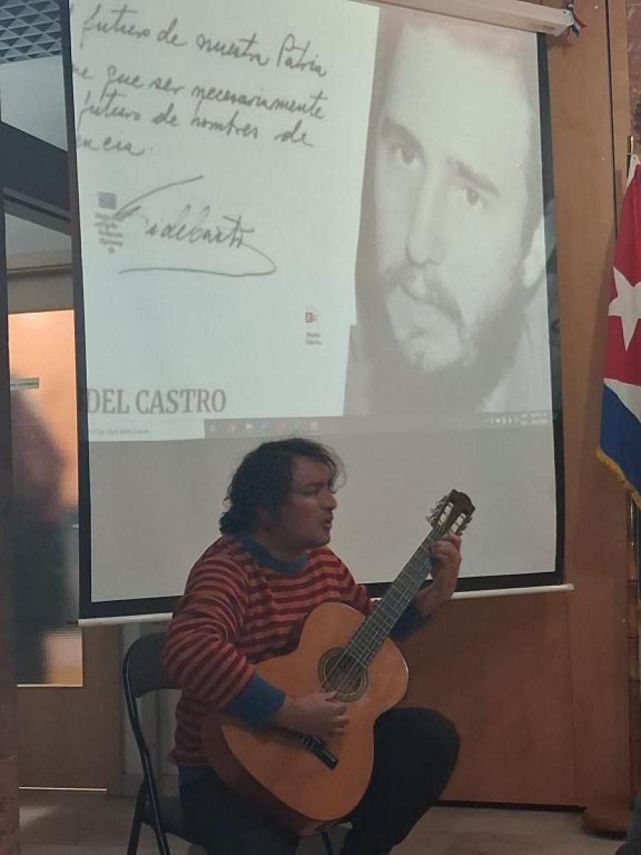 Finalmente, los presentes depositaron rosas blancas en la escultura dedicada al Héroe Nacional en la sede de la misión cubana. La noche cerró con la música del activista chileno y cantautor Nicolás Rodrigo Miquea y el cubano Román Bombarlé, en un canto de denuncia a los crímenes del imperialismo, de convocatoria a no mirar a otro lado ante las injusticias y de homenaje a la obra del Apóstol con la musicalización de sus versos sencillos.