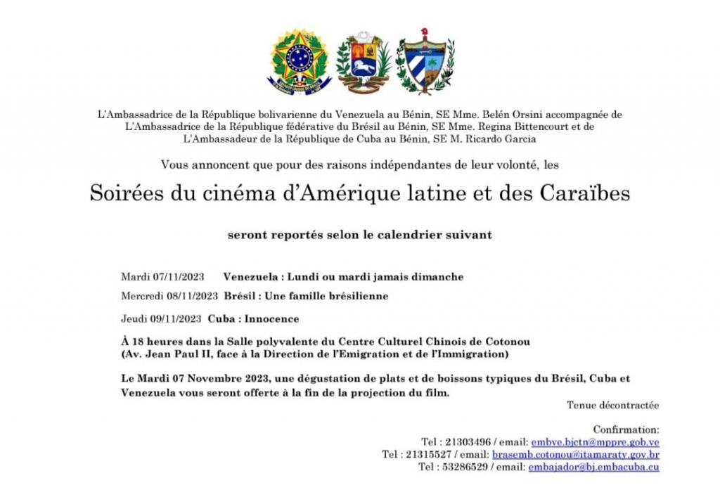 Cotonou, 8 de noviembre del 2023.- En el Centro Cultural Chino de Cotonou, República de Benin, quedó inaugurada en el día de ayer la muestra del Cine Latinoamericano integrada por filmes de Venezuela, Brasil y Cuba. A la cita acudieron invitados del gobierno, cuerpo diplomático acreditado, miembros de las comunidades nacionales de cada país, profesionales egresados de Cuba, entre otras personalidades. Los embajadores de Venezuela, Teresa Orsini Pic, de Brasil, Regina Bitencourt y de Cuba, Ricardo García Napoles, al hacer uso de la palabra agradecieron a los presentes por la asistencia al evento y los invitaron a presenciar una filmografía hecha en el continente americano y el Caribe.
