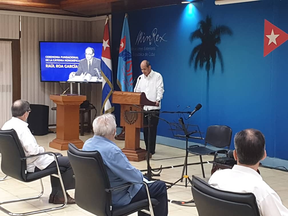 La Habana, 7 de julio de 2021.- La ceremonia fundacional de la Cátedra Honorífica “Raúl Roa García” tuvo lugar este miércoles en la sede del Ministerio de Relaciones Exteriores, durante un acto presidido por el miembro del Buró Político del CC-PCC y ministro de Relaciones Exteriores, Bruno Rodríguez Parrilla, y con la presencia del jefe del Departamento Ideológico del CC-PCC, Rogelio Polanco Fuentes, y el rector del Instituto Superior de Relaciones Internacionales (ISRI), Rogelio Sierra Díaz, entre otras autoridades.