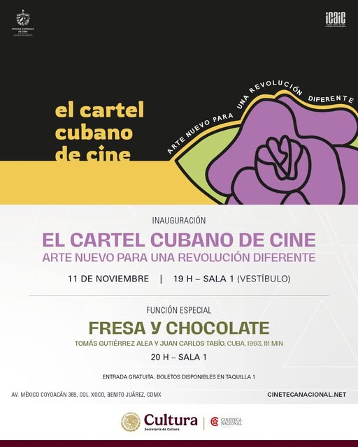 Ciudad de México.– Como parte de las celebraciones por la Jornada de la Cultura Cubana y en homenaje al Instituto Cubano del Arte e Industria Cinematográficos (ICAIC), se inaugurará la exposición: "El Cartel Cubano de Cine. Arte nuevo para una Revolución diferente" el próximo martes 11 de noviembre en las instalaciones de la Cineteca Nacional.