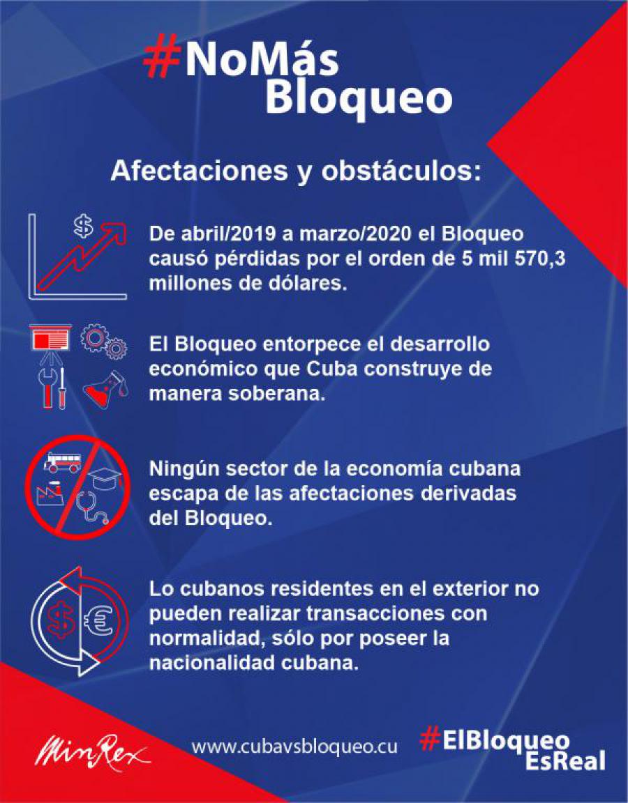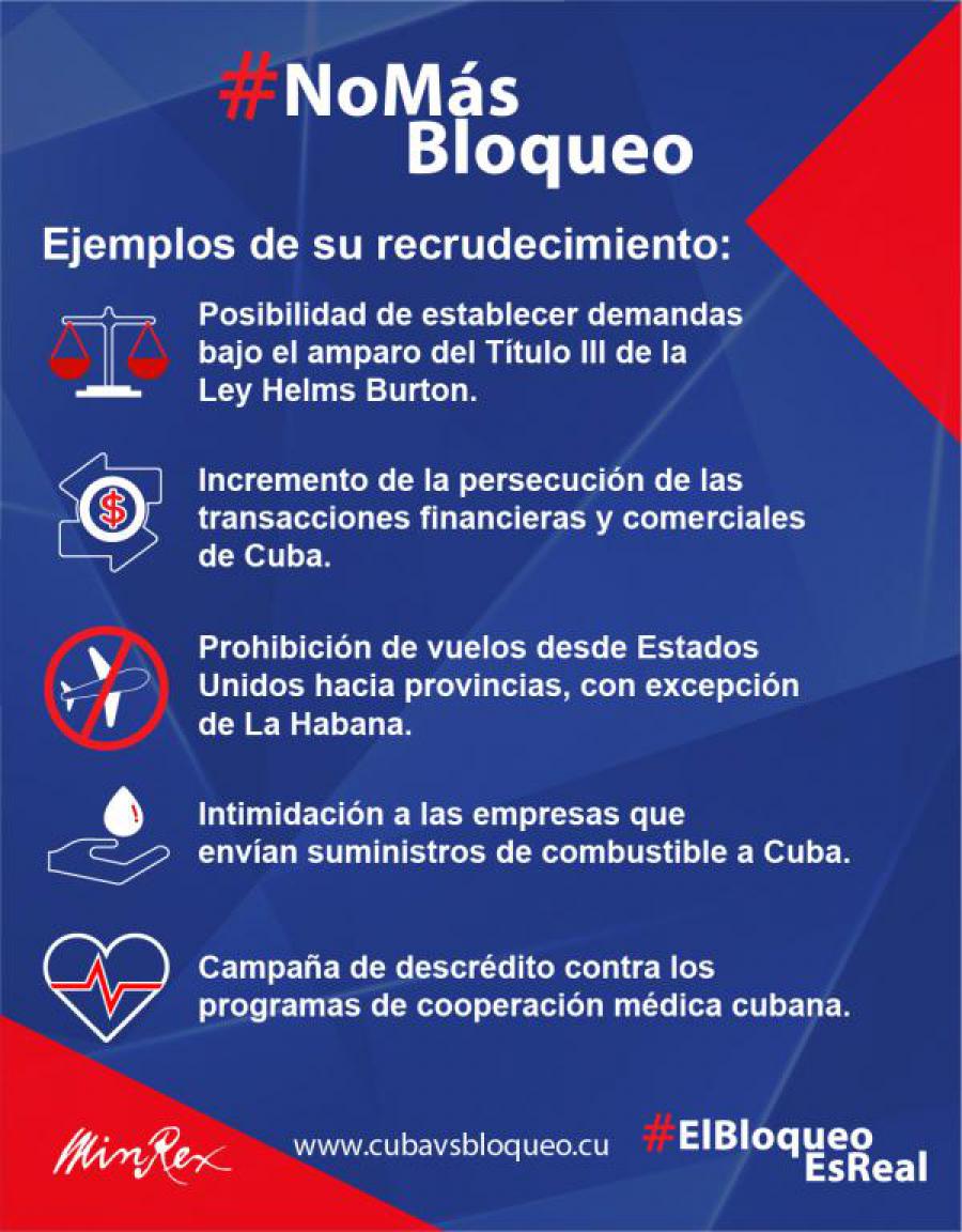 Entre abril de 2019 y marzo de 2020, el gobierno de los EE.UU. reforzó el bloqueo contra Cuba hasta alcanzar niveles de agresividad sin precedentes. En particular, la dimensión extraterritorial de esta política se ha intensificado brutalmente con la aplicación íntegra de la Ley Helms-Burton desde mayo de 2019. Esta legislación constituye una afrenta a los principios del Derecho Internacional y a las normas internacionales de comercio, en tanto dispone acciones de presión económica lesivas a la soberanía de Cuba y de terceros países. Otras medidas nocivas para la economía y el pueblo cubanos aplicadas en este período son: el incremento de la persecución de las transacciones financieras y comerciales de Cuba, el asedio para privar al país de los suministros de combustible, la prohibición de vuelos desde los EE.UU. a las provincias cubanas fuera de La Habana y la campaña de descrédito contra los programas de cooperación médica cubana.