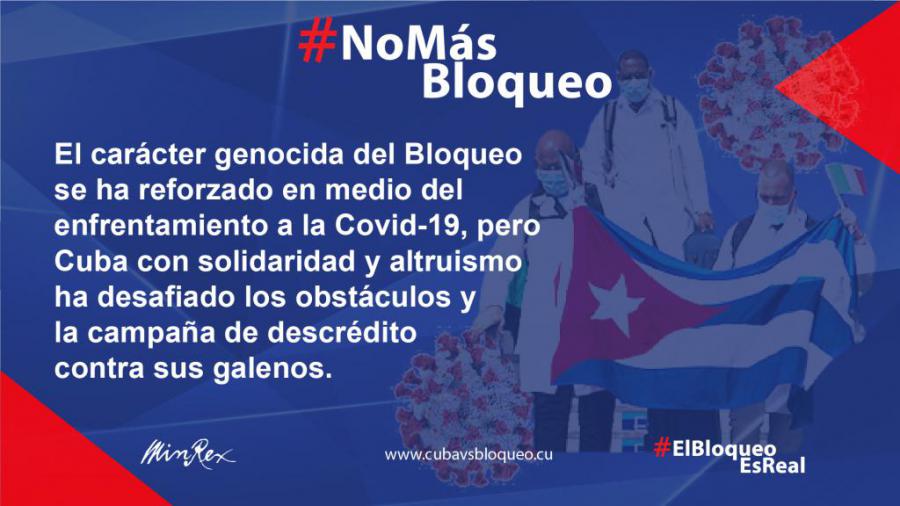 En este contexto, el azote de una pandemia global como la COVID-19 ha supuesto retos notables para Cuba, y los esfuerzos del país para combatirla se han visto sensiblemente limitados por las regulaciones del bloqueo estadounidense. El carácter genocida de esta política se ha reforzado en medio del enfrentamiento al nuevo coronavirus, puesto que el gobierno de los EE.UU. se ha valido de ella, y en particular de su componente extraterritorial, para privar deliberadamente al pueblo cubano de ventiladores pulmonares mecánicos, mascarillas, kits de diagnóstico, gafas protectoras, trajes, guantes, reactivos y otros insumos necesarios para el manejo de esta enfermedad. La disponibilidad de estos recursos puede marcar la diferencia entre la vida y la muerte para los pacientes portadores del virus, así como para el personal de la salud que los atiende.