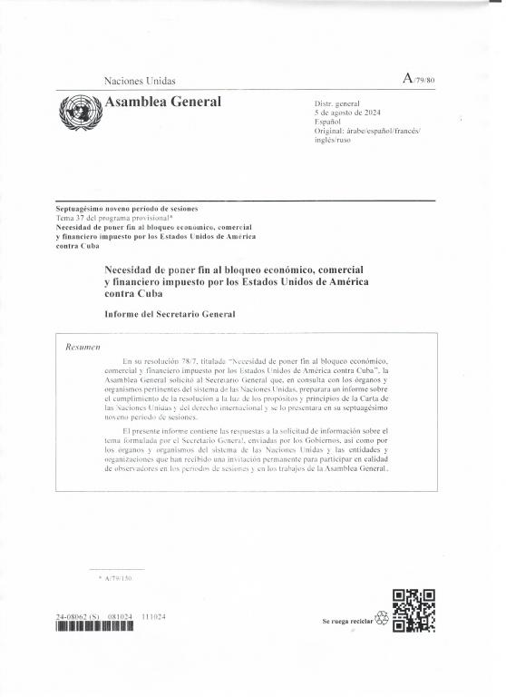 Informe del Secretario General de Naciones Unidas en los seis idiomas oficiales de la ONU, elaborado en virtud de la resolución de la Asamblea General de las Naciones Unidas 78/7, titulada “ Necesidad de poner fin al bloqueo económico, comercial y financiero impuesto por los Estados Unidos de América contra Cuba”; con las contribuciones de 183 Estados y 35 organismos internacionales.