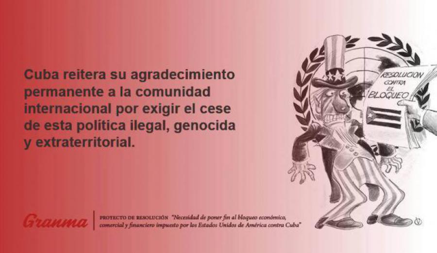 A pesar de las fuertes presiones ejercidas por los EE.UU., la comunidad internacional rechazó sus propuestas, al tiempo que expresó una vez más, su apoyo abrumador a la resolución de condena al bloqueo.