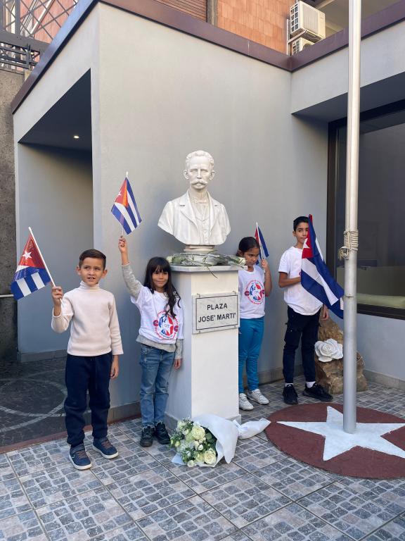 Come parte delle iniziative che avviano l'Incontro, un gruppo di bambini ha deposto delle rose bianche davanti al busto dell'eroe nazionale José Martí, situato presso la sede dell'Ambasciata cubana.