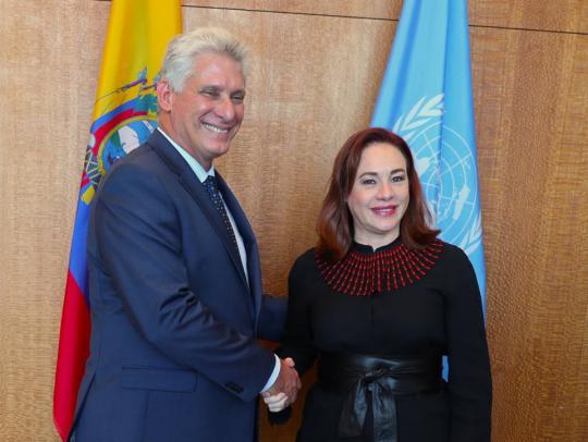 După prima intervenție în numele păcii mondiale, șeful statului cubanez a ținut o întâlnire cordială la sediul Organizației Națiunilor Unite cu președintele salvadoran, Salvador Sánchez Cerén. În timpul unei vizite oficiale pe insulă în 2015, în care a fost primit de către generalul armatei Raúl Castro Ruz, Cerén și-a exprimat dorința națiunii de a continua aprofundarea schimbului cu Cuba. În 2016, a fost prezent în rândul personalităților lumii care au participat la ultimul rămas bun de la comandantul principal Fidel Castro. Dezvoltarea programelor sociale și cooperarea în domeniile științific, tehnic, sanitar și cultural sunt punți care unesc cele două națiuni. Sanchez Ceren a spus în zilele trecerii sale prin Antilele Mari, Mântuitorul a avut întotdeauna solidaritatea poporului și guvernul din Cuba „care are acea dragoste imensă pentru popoarele lumii.“ După ora trei după-amiaza, Díaz-Canel a avut o întrevedere cu Antonio Guterres, secretarul general al Națiunilor Unite, care și-a asumat această responsabilitate în ianuarie 2017.