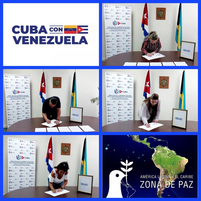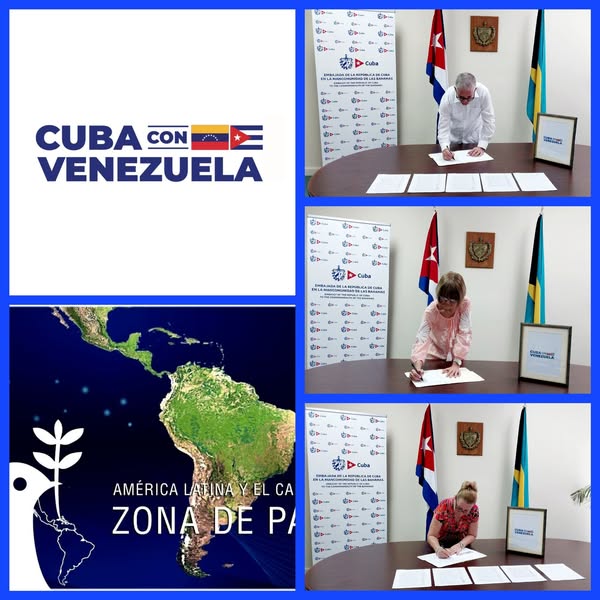 Nassau, 30 de septiembre de 2025. Integrantes de la Misión Estatal de Cuba en Las Bahamas firmaron un documento que respalda la Declaración del Gobierno Revolucionario Cubano en solidaridad con Venezuela.