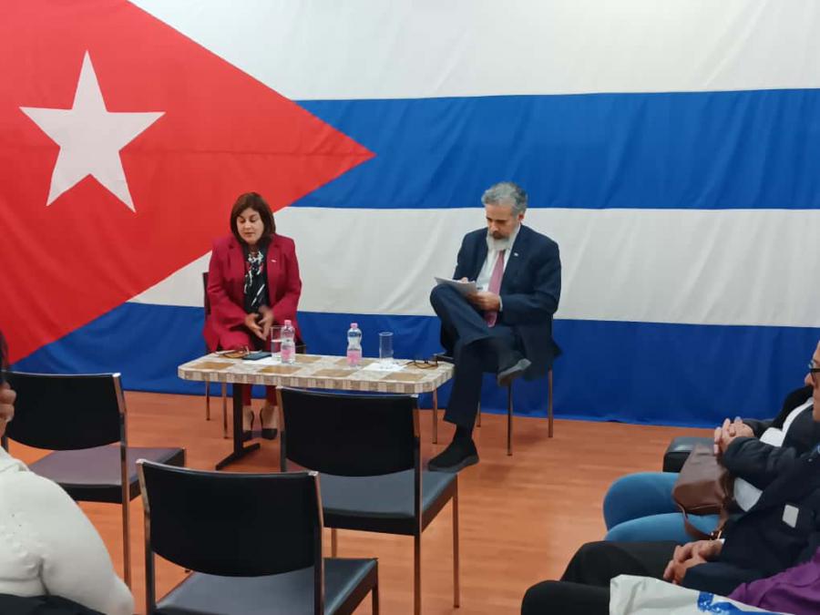 Ginebra, 25 de octubre de 2025. En el contexto de su participación en la 16 Conferencia de Naciones Unidas sobre Comercio y Desarrollo, Déborah Rivas Saavedra, viceministra de Comercio Exterior y la Inversión Extranjera, sostuvo un fraternal diálogo con el colectivo de la Misión Permanente de Cuba ante la ONU en esta ciudad suiza.