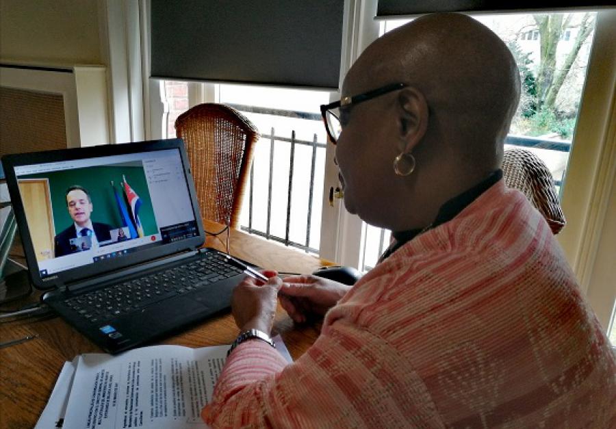 Bruselas, 15 de marzo de 2021// La embajadora de Cuba ante el Reino de Bélgica, el Gran Ducado de Luxemburgo y jefa de Misión ante la Unión Europea, Norma Goicochea Estenoz, y el Director General de Asuntos Multilaterales y Globalización del Servicio Público Federal Asuntos Exteriores, Comercio y Cooperación para el Desarrollo del Reino de Bélgica, Axel Kenes, intercambiaron sobre varios temas multilaterales de interés común.