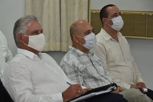 El Presidente de la República, Miguel Díaz-Canel Bermúdez, intercambió en la mañana de este lunes con un grupo de científicos que trabajan incansablemente en la vacuna cubana contra la COVID-19, peligrosa enfermedad que en el mundo ha causado la muerte a más de 766 mil personas, 88 en el territorio nacional.