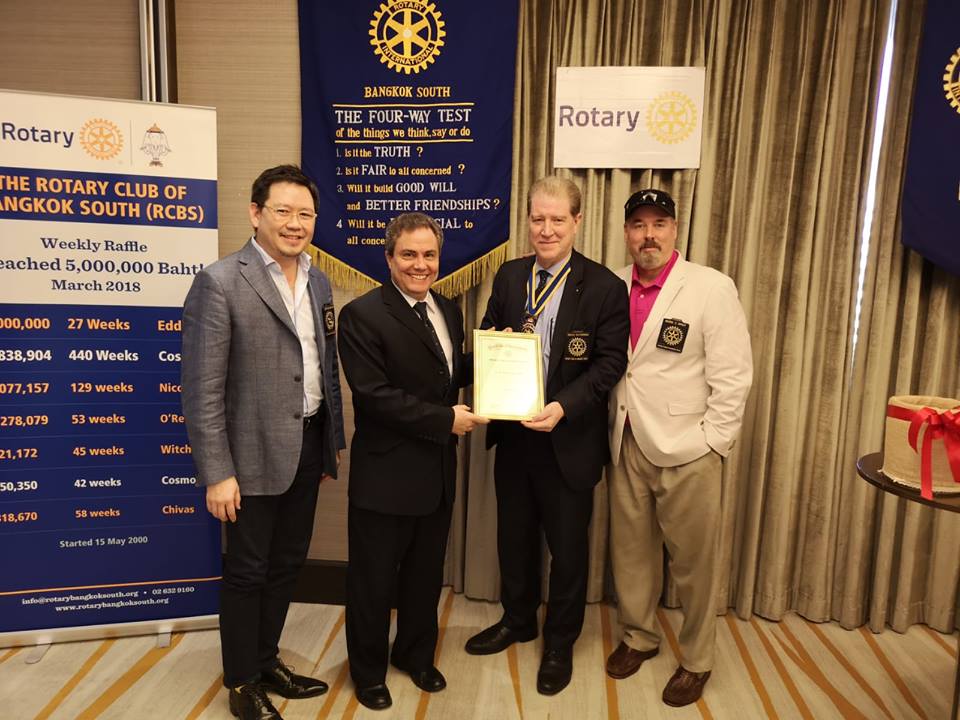 Agradezco al "Club Rotario de Bangkok Sur", a su Presidente y miembros, por la cálida bienvenida y por la sincera invitación a visitarlos nuevamente.