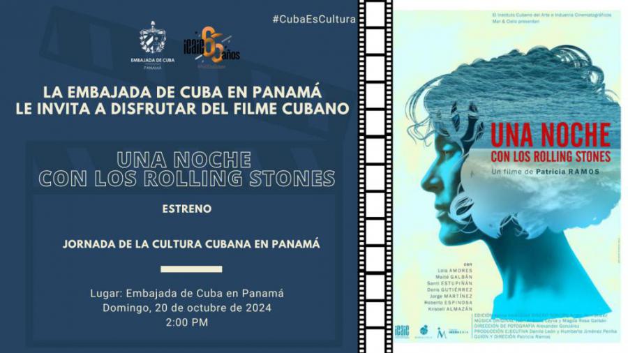 Ciudad Panamá, 14 de octubre de 2024. Como parte jornada de celebración del Día de la Cultura Cubana en Panamá y en contexto del 65 Aniversario del ICAIC, la Embajada de Cuba en Panamá se complace en anunciar la puesta en exhibición de la película: "Una noche con los Rolling Stones". Esta película se ambienta en La Habana del 2016, y se concentra completamente en la vida cotidiana, común, de una mujer madura, y cuatro necesarios acompañantes: un hijo adolescente que quiere vivir en el extranjero, una madre anciana que quiere morir tranquilamente, un amante casado y mentiroso que se empeña en seguir con ella, y una amiga de toda la vida, actriz frustrada que no quiere envejecer. Rita es una sobreviviente, probablemente en busca de algo que no sabe nombrar ni mucho menos definir. En medio de todo, y sin esperarlo particularmente, llega la noche de fiesta y agitación que acompañó el magno concierto con los Rolling Stones en la Ciudad Deportiva.