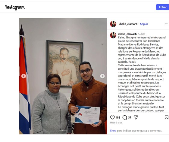 Esta reunión de alto nivel marcó un hito particularmente significativo, caracterizado por un diálogo profundo y constructivo, desarrollado en un ambiente de respeto y estima mutuos. Los debates se centraron en las sólidas y duraderas relaciones históricas entre el Reino de Marruecos y la República de Cuba, así como en la cooperación basada en la confianza y el entendimiento mutuo. Este diálogo de alta calidad, tanto por su rico contenido como por su elegante formato, reflejó plenamente la profundidad de las relaciones bilaterales y la importancia de seguir fortaleciéndolas y desarrollando sus perspectivas de futuro, lo cual apreciamos y encomiamos profundamente. Fue con un profundo sentido de gratitud, orgullo y alta estima que este certificado fue entregado por Su Excelencia la Sra. Liurka Rodríguez Barrios, Representante de la República de Cuba ante el Reino de Marruecos, en un gesto distinguido que encarna el espíritu de cooperación y amistad que une a los dos países amigos.