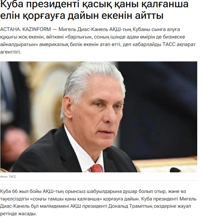 — Куба — еркін, тәуелсіз және егемен ел. Ешкім бізге не істеу керегін айтуға құқығы жоқ. Куба шабуыл жасамайды, АҚШ бізге 66 жыл бойы шабуыл жасап келеді. Куба қорқытып жатқан жоқ, ол өзін соңғы тамшы қанына дейін қорғауға дайындалып жатыр және дайын, — деп жазды Диас-Канель X әлеуметтік желісінде.