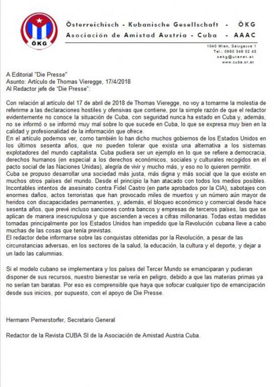 Con relación al artículo del 17 de abril de 2018 de Thomas Vieregge, no voy a tomarme la molestia de referirme a las declaraciones hostiles y ofensivas que contiene, por la simple razón de que el redactor evidentemente no conoce la situación de Cuba, con seguridad nunca ha estado en Cuba y, además, no se informó o se informó muy mal sobre lo que sucede en Cuba, lo que se expresa muy bien en la calidad y profesionalidad de la información que ofrece.