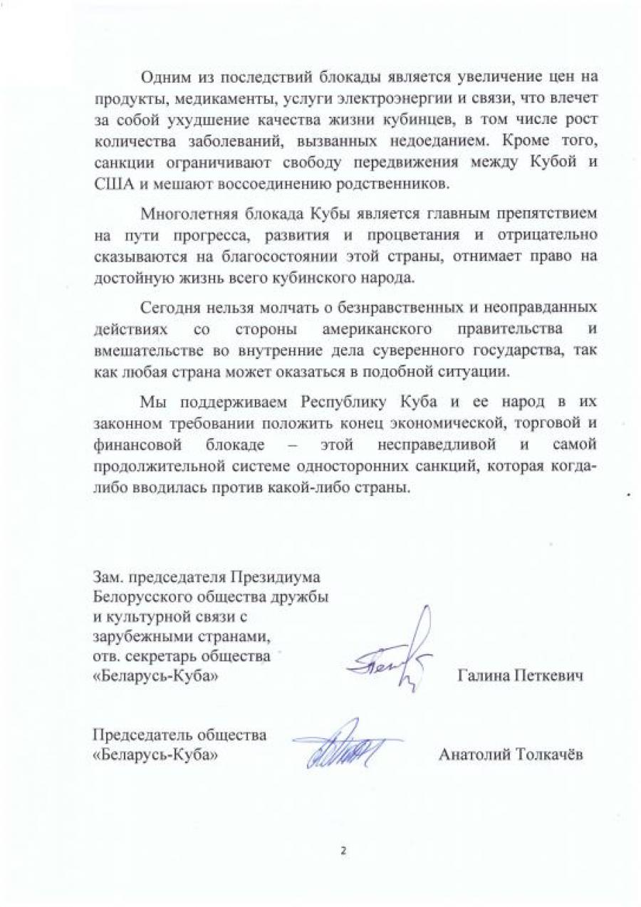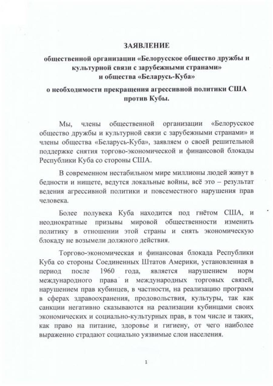 Nosotros, los miembros de la Organización Pública “La Asociación de amistad y la colaboración cultural con los países foráneos de Belarús” y de la Asociación “Belarús – Cuba” declaramos nuestro firme apoyo a que los Estados Unidos levanten el bloqueo comercial, económico y financiero contra la República de Cuba.