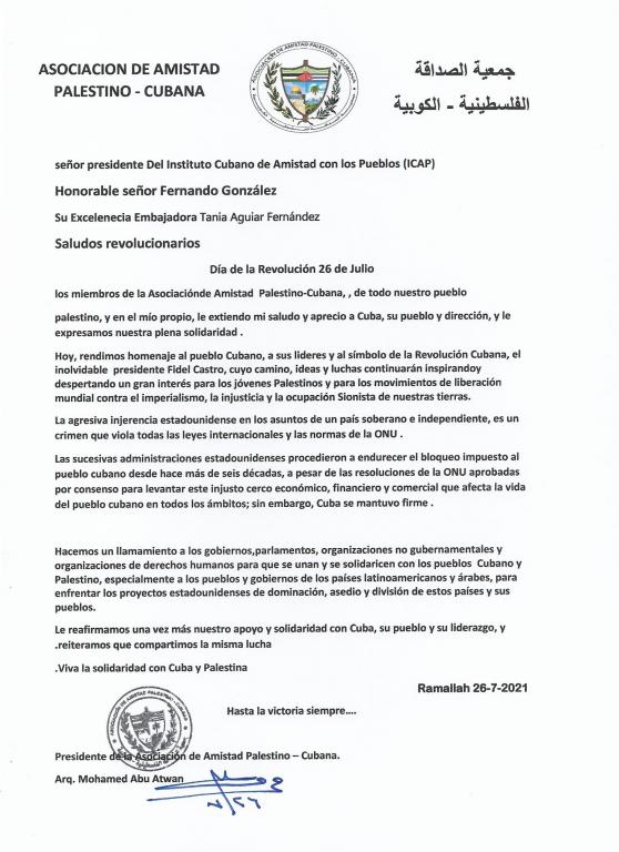 La Asociación de Amistad Palestina Cubana envía un mensaje de felicitación al presidente del Instituto Cubano de Amistad con los Pueblos, Fernando González, por el aniversario del ataque a los cuarteles de Moncada y Carlos MD Céspedes.