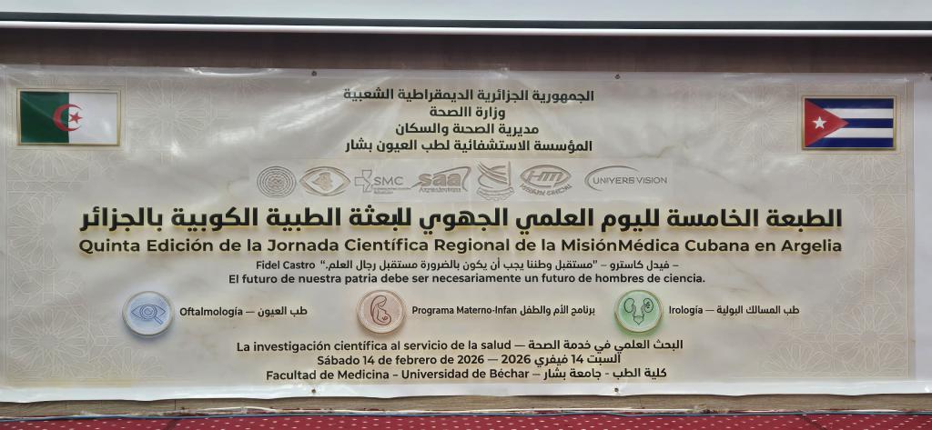 Béchar, 14 de febrero 2026. — Con la participación activa de profesionales de la salud cubanos y argelinos, se celebró la V Jornada Científica de la Brigada Médica Cubana en Béchar, consolidándose como un espacio de alto valor académico para el intercambio de experiencias y la actualización científica en beneficio de la población.