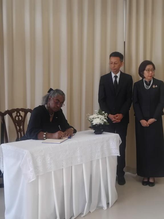 Dili, 30 de octubre de 2025. En la sede de la embajada del Reino de Tailandia, su embajador Atipat Rojanapaibulya acompañado por su esposa y funcionarios de su Embajada, recibieron a la jefa de la Misión diplomática Alina Aldama, quien firmó el Libro de Condolencias en ocasión del fallecimiento de Su Majestad la Reina Madre Sirikit.