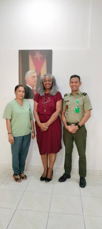 Dili, 23 de diciembre de 2025. En la sede de la Cancillería cubana, la embajadora Alina Aldama sostuvo encuentro con Lidia Pire de Recursos Humanos y el Dr. Edmundo S. Monteiro de Salud Militar, quienes realizaron visita de cortesía para realizar algunas puntualizaciones sobre estudiantes que realizan especialidades médicas a través de la Comercializadora de Servicios Médicos Cubanos (CSMC).