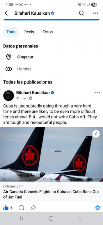 El Prof. Bilahari Kausikan, ex Representante Permanente de Singapur ante NN.UU, y ex Secretario Permanente de la Cancillería, publicó en su muro de Facebook el anuncio de la cancelación temporal de los vuelos de Air Canada debido a la falta de combustible fuel para los aviones, por el impacto del ilegal bloqueo energético del gobierno de los EE.UU contra nuestro país y comentó: