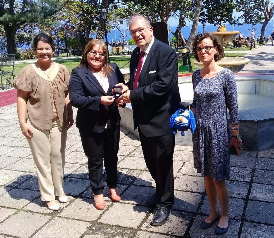 El Prof. Dr. Shareck le entregó a la Rectora de la Universidad Central de Las Villas, Dra. Osana Moleiro, la medalla 600 Aniversario de la Universidad de Rostock.