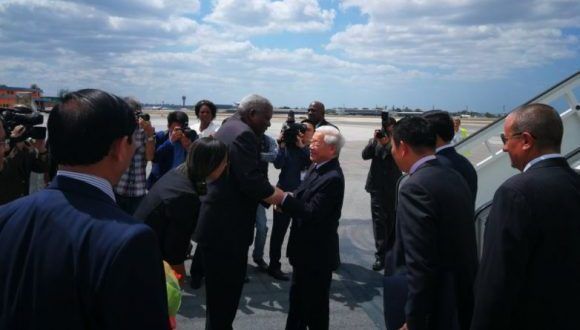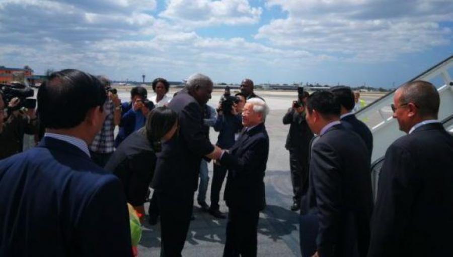 El Secretario General del Partido Comunista de Vietnam, compañero Nguyen Phu Trong, llegó al aeropuerto internacional José Martí en visita oficial a Cuba, donde fue recibido por el miembro del Buró Político del Partido Comunista de Cuba y presidente de la Asamblea Nacional, Esteban Lazo Hernández.