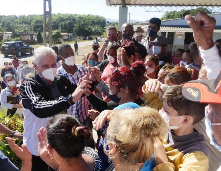 «Díaz-Canel te queremos» o «Pa´ lo que sea Canel, pa´ lo que sea», a lo que el Jefe de Estado correspondió con el saludo más afectuoso hacia una comunidad que lo conoce al dedillo desde los años en que él fungió como Primer Secretario del Partido en la provincia de Villa Clara.
