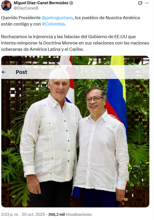 «Querido Presidente Gustavo Petro, los pueblos de Nuestra América están contigo y con Colombia», declaró el mandatario cubano. «Rechazamos la injerencia y las falacias del Gobierno de Estados Unidos que intenta reimponer la Doctrina Monroe en sus relaciones con las naciones soberanas de América Latina y el Caribe», añadió el mandatario.