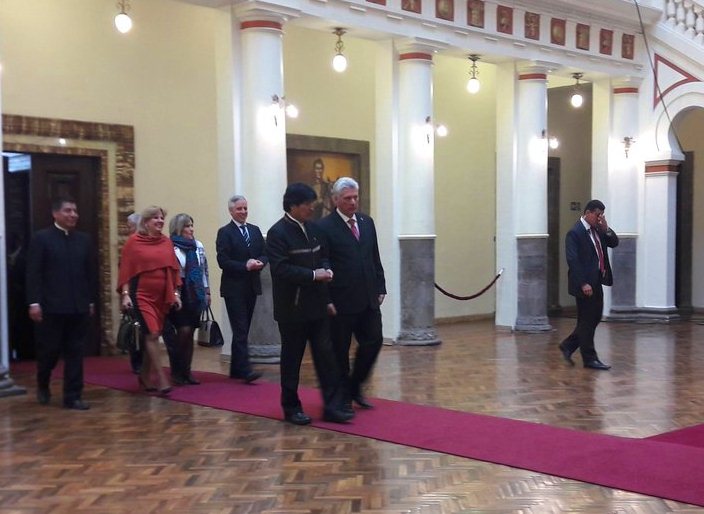 La Paz, Bolivia, 26 de mayo de 2017.- El presidente del Estado Plurinacional de Bolivia, Evo Morales Ayma, recibió esta tarde en el Palacio de Gobierno al compañero Miguel Díaz-Canel Bermúdez, primer vicepresidente de los Consejos de Estado y de Ministros de la República de Cuba, quien cumplimenta una visita oficial en esta nación.