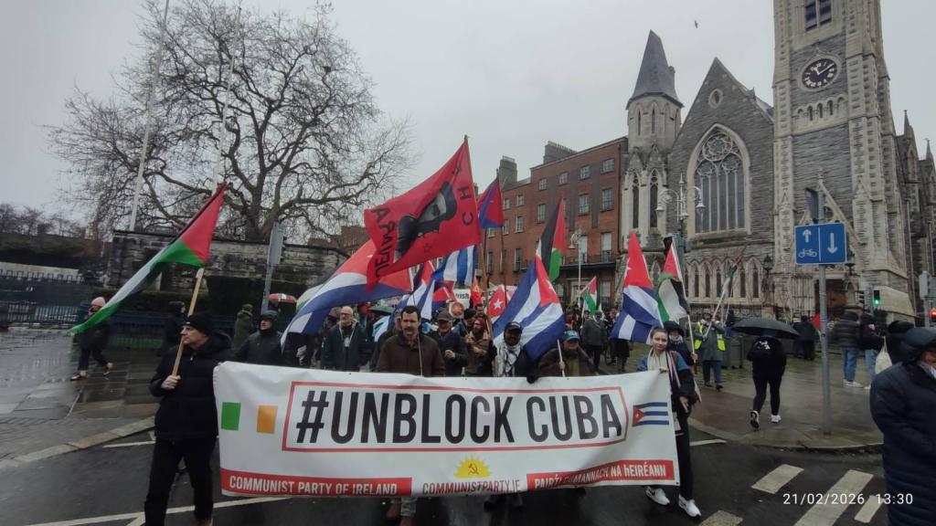 Dublín, 22 de febrero, 2026. Al mediodía de ayer sábado, convocados por el Partido Comunista de Irlanda, en el marco de las acciones en apoyo a Palestina, en esta ocasión centenares de manifestantes marcharon por las calles de la capital de Irlanda para denunciar también las acciones contra el pueblo cubano.