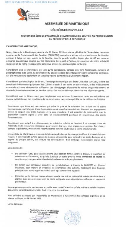 En una reciente sesión plenaria celebrada en Fort-de-France, la Asamblea de la Colectividad de Martinica adoptó por unanimidad una moción en respaldo al pueblo cubano, manifestando su preocupación por las consecuencias del bloqueo económico, comercial y financiero impuesto por los Estados Unidos desde hace más de seis décadas.