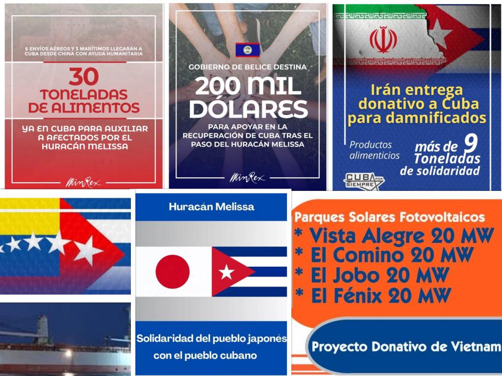 El noble gesto solidario del hermano gobierno de Belice se manifestó en una contribución monetaria de $200,000 USD. La República Islámica de Irán realizó un donativo equivalente a más de 9 toneladas de productos alimenticios a Cuba para apoyar a las familias afectadas por el huracán Melissa, en cuya entrega la viceministra cubana de Comercio Interior, Araceli Cardoso Hernández, la destacó como “solidaridad genuina”.