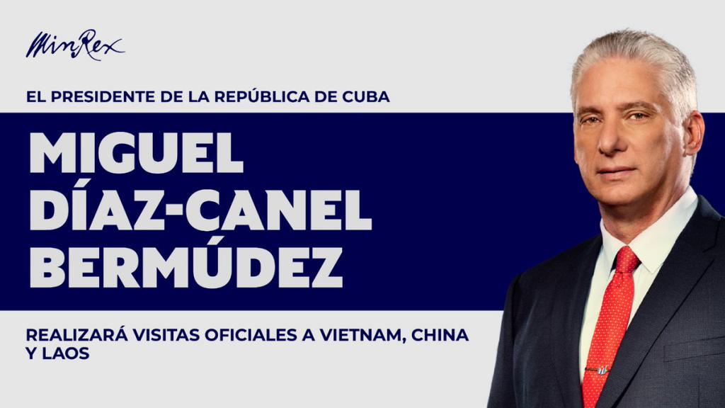 El primer secretario del Comité Central del Partido Comunista de Cuba y presidente de la República, Miguel Díaz-Canel Bermúdez, realizará visitas oficiales a la República Socialista de Vietnam, la República Popular China y la República Democrática Popular Lao, correspondiendo a invitaciones extendidas por sus homólogos.