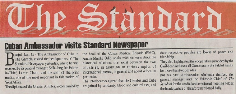 The Standard, al igual que su similar The Voice, subrayaron en sus páginas que el diplomático de la mayor de las Antillas y su acompañante, la jefa de la Brigada Médica Cubana (BMC) en Gambia, Anaris Martha Odio, fueron recibidos en la sede del primero por su gerente general, Salla Jeng, su editor jefe, Lamin Cham, además de varios periodistas miembros del staff del citado cotidiano.
