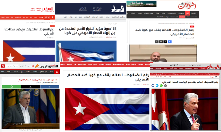 Unos 15 diarios publicaron artículos en sus sitios digitales resaltando la victoria cubana y el amplio apoyo de la comunidad internacional. La victoria de Cuba muestra una vez más el aislamiento de Estados Unidos en el tema al lograr que solo 7 países se opusieran a la resolución cubana.