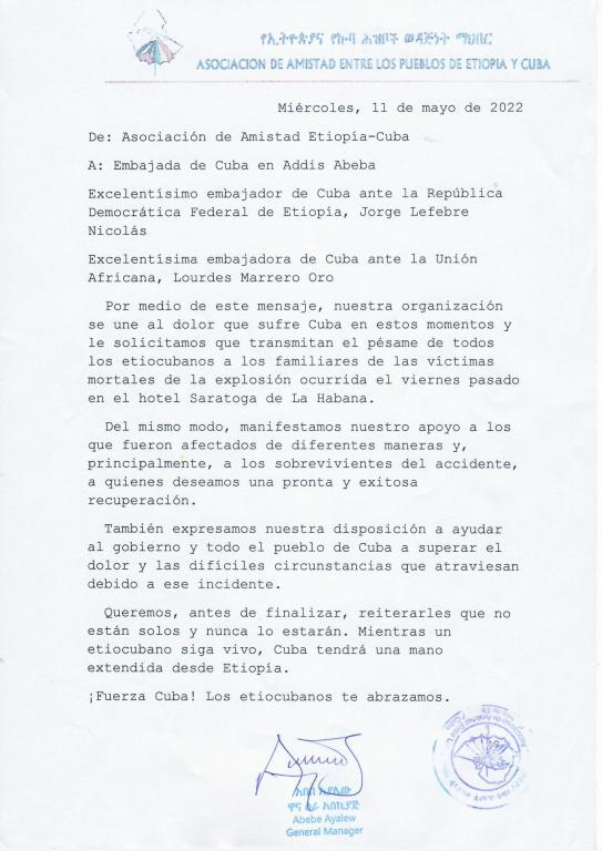 Mensaje de Asociación de Amistad entre los Pueblos de Etiopía y Cuba por consecuencias de la explosión ocurrida en el Hotel Saratoga