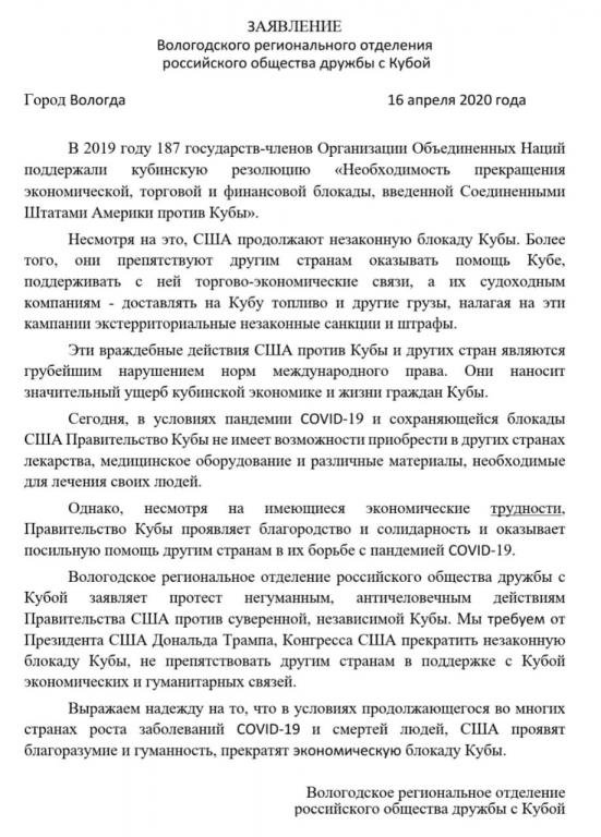 Mensaje de condena al bloqueo de oficina regional de Sociedad de Amistad Rusia Cuba en Vologda