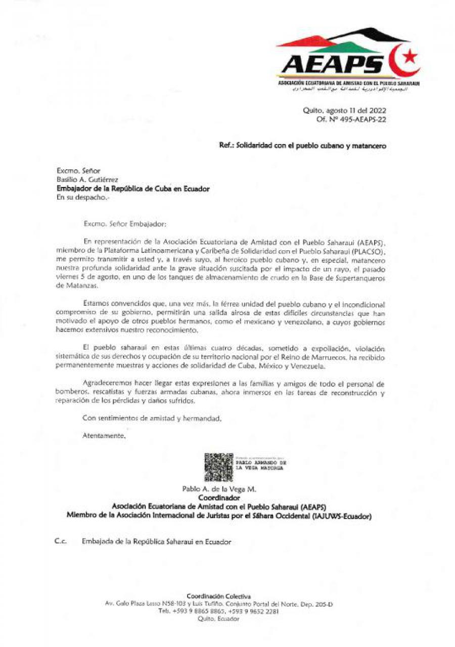 Quito, 11 de agosto de 2022:- En representación de la Asociación Ecuatoriana de Amistad con el pueblo saharaui (AEAPS), su coordinador Pablo A. de la Vega Mayorga hizo entrega al Embajador Basilio Gutierrez de un mensaje de solidaridad con el pueblo cubano y particularmente con el matancero con motivo del siniestro causado por el impacto de un rayo en la base de supertanqueros de Matanzas el pasado 5 de agosto..