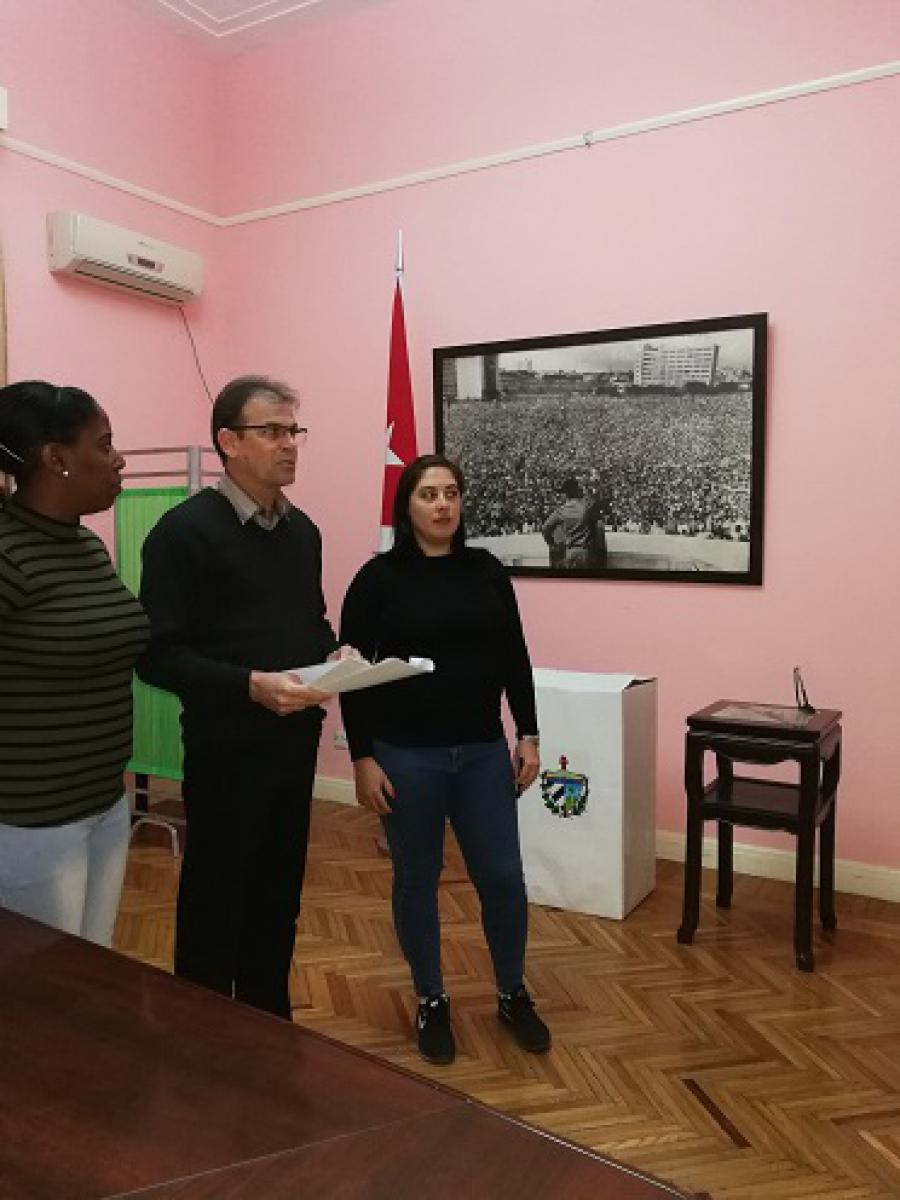 Beijing, 16 de febrero de 2019.- Luego de entonar las notas de nuestro Himno Nacional fueron constituidas los colegios electorales de la Circunscripción Electoral Especial en China ubicadas en Beijing, Shanghai y Guangzhou, donde ejercerán el voto para refrendar nuestra Constitución los funcionarios, trabajadores y estudiantes de esta Misión Estatal, tal y como establece la Ley Electoral.
