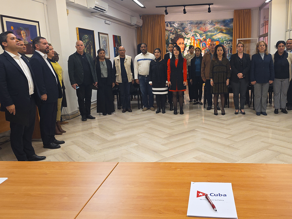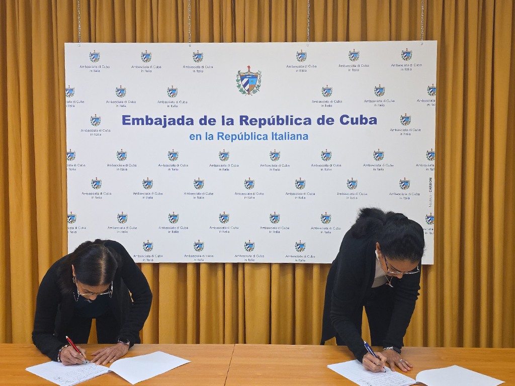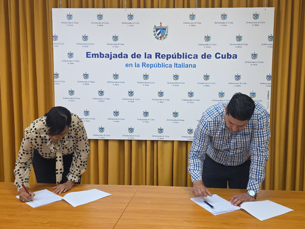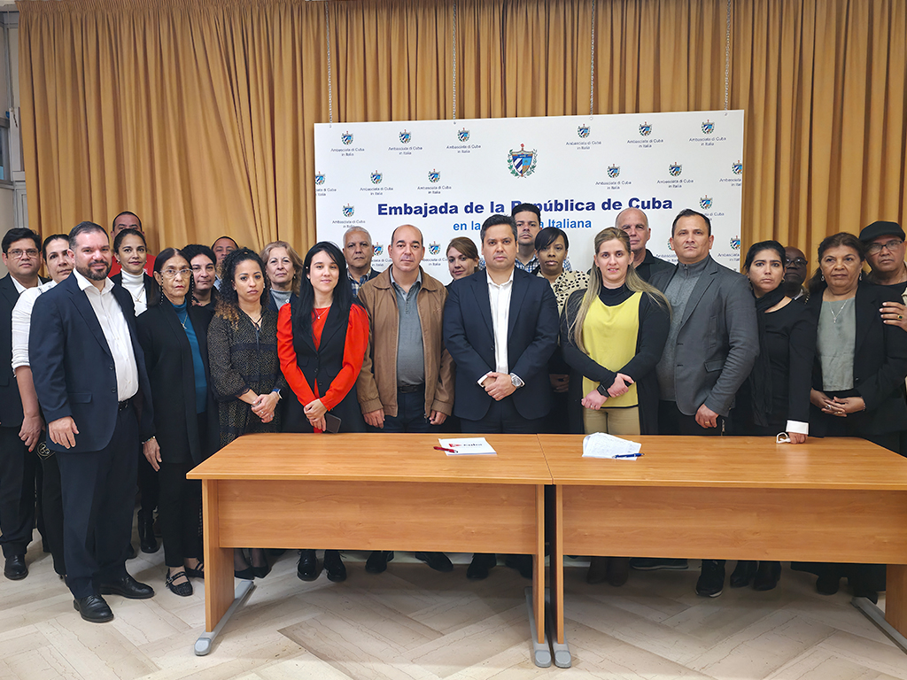 Roma, 24 de abril de 2026. – Los miembros de la Misión Estatal de Cuba en Italia se sumaron hoy, con sus rúbricas, al compromiso "Mi firma por la Patria", para así ratificar la voluntad de defender al país ante las amenazas del gobierno de EEUU.